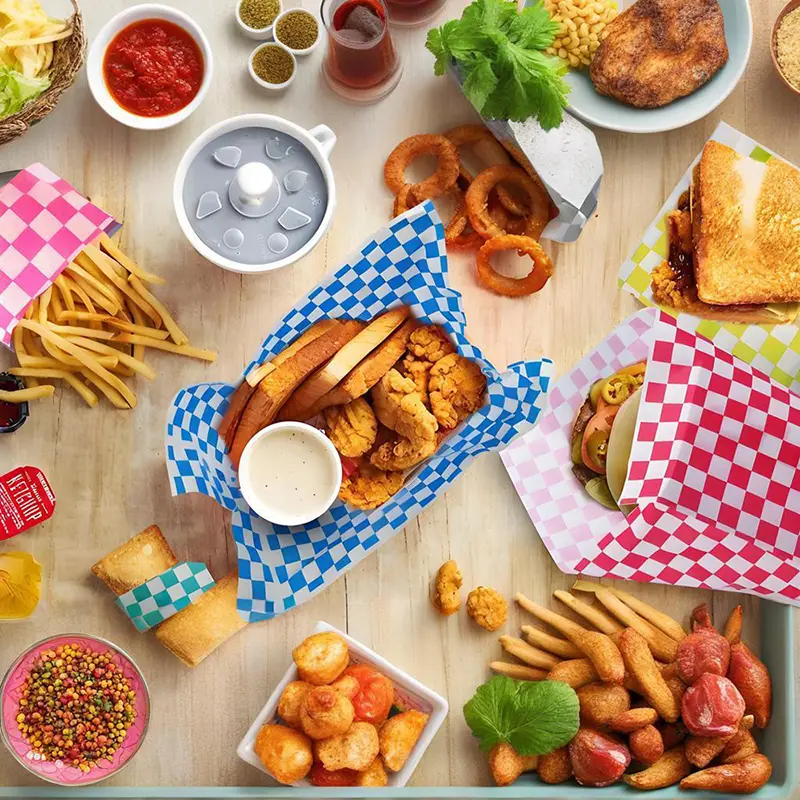 CÔNG TY TNHH SẢN PHẨM NHỰA NINGBO POWERR cung cấp cho bạn Giấy Hamburger 38 * 28cm sáng tạo theo phong cách Mỹ tại Trung Quốc. Nó là một loại giấy bao bì thực phẩm chuyên nghiệp với các tính năng chống dầu, chống nước và chống dính. Bạn có thể sử dụng nó để đóng gói bánh mì kẹp thịt, bánh mì sandwich, đồ chiên, đồ nướng, trái cây, bánh quy, đồ nướng, v.v. Hơn nữa, nó còn có thể là đế lót ly tạm thời, hộp đựng, vật liệu thủ công, đạo cụ chụp ảnh, đạo cụ hoạt động, v.v. Lối sống đa dạng đã cho phép nó phát huy khả năng sáng tạo ở mức độ ngày càng cao. Nếu bạn có bất kỳ thiết kế mới nào cho sản phẩm này, vui lòng hợp tác với chúng tôi để phát triển.