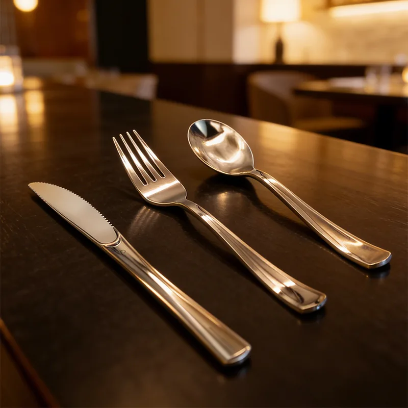 Bộ dao nĩa nhựa cổ điển được ứng dụng rộng rãi. Trong tiệc cưới, phong cách kim loại có thể kết hợp với đồ trang trí đám cưới để tôn lên vẻ sang trọng tổng thể và trở thành điểm nhấn của bàn tiệc; tại các cuộc họp mặt kinh doanh, thiết kế đơn giản và tinh tế có thể phù hợp với không khí trang trọng của môi trường kinh doanh, làm nổi bật chất lượng; trong các bữa tiệc gia đình và họp mặt bạn bè, phương pháp sử dụng tiện lợi cũng có thể tạo thêm cảm giác trang trọng cho bữa ăn. Ngoài ra, sản phẩm còn phù hợp cho các bữa tiệc ngoài trời, lễ hội, họp mặt thường niên của công ty, v.v. Đặc điểm nhẹ và bền có thể tránh được rủi ro hư hỏng khi sử dụng ngoài trời một cách hiệu quả.