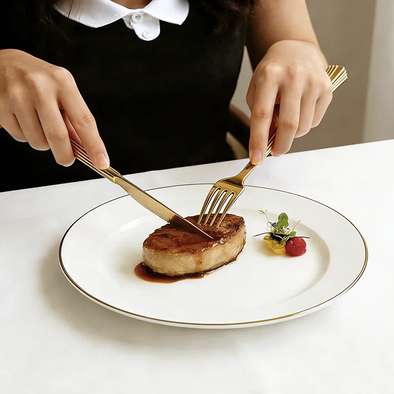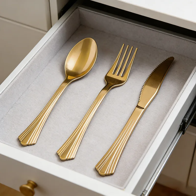 Lớp phủ vàng bao phủ đều mọi cạnh, cho phép bộ đồ ăn phản chiếu sự chuyển màu tinh tế giữa ánh sáng và bóng tối dưới ánh sáng. Nó cho phép vật liệu nhựa có kết cấu chắc chắn như bộ đồ ăn bằng kim loại, loại bỏ hoàn toàn cảm giác rẻ tiền.